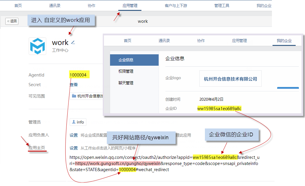 進(jìn)入管理后臺-> 我的企業(yè) 最下方 紅圈所示。 這里是準(zhǔn)備材料說的 企業(yè)id