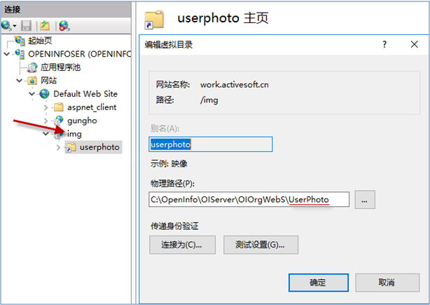 第三步:在img應用下面創建虛擬目錄 userphoto (固定不能改),地址指向org 服務下 userPhoto目錄