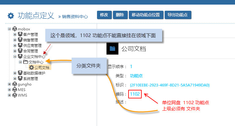 Mobox文檔中心定義 – 1101 及 1102 功能點 注意 2023/09/13 分類:產品中心 實施方案 846 mobox文檔中心可以掛接 1、單位網盤? ? ? ?(1102 功能點) 2、部門網盤? ? ? ?(1102 功能點) 在設置的Mobox文檔中心的時候,功能點不能直接掛到領域下面,而必須在領域下面先建立分類文件夾,之后才能掛接這2個功能點。 若直接掛到領域下面,會出現 而需要改成下圖發設置方法 標簽:方案 上一篇: 低代碼平臺關于數據對象定版后權限控制 下一篇: 關于Gungho及Mobox的授權(臨時授權部分)