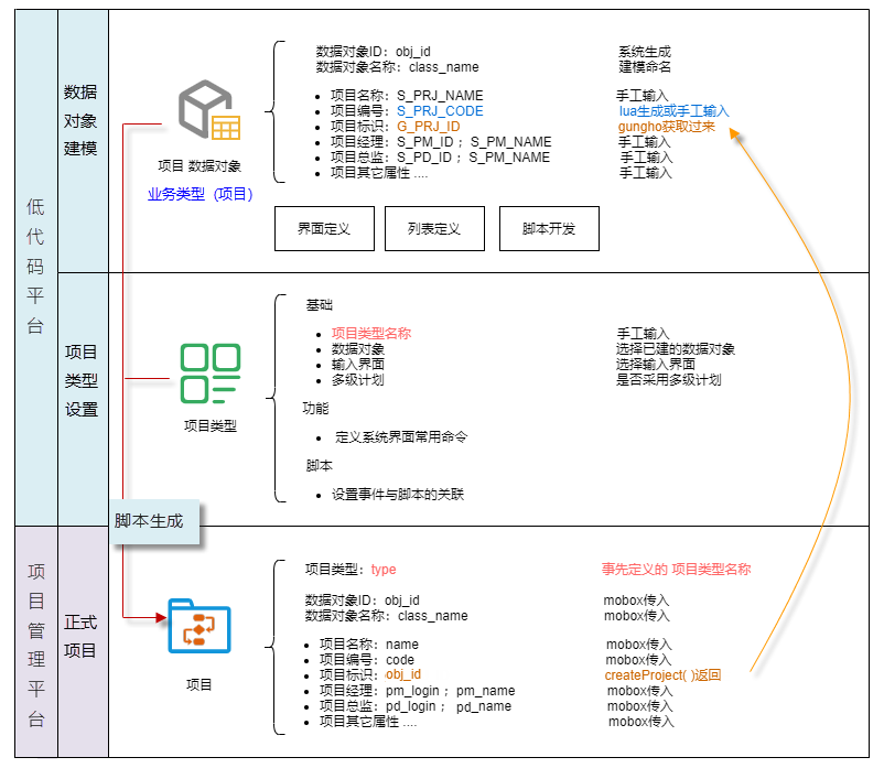 Mobox 數據對象先創建 –》之后通過腳本生成Gungho的項目 –》得到Gungho項目的prj_id –》更新mobox數據對象的 G_PRJ_ID