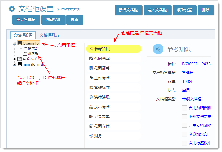 1)創(chuàng)建(文檔柜),并設(shè)置文檔柜管理員及文檔柜回收箱管理員。(文檔柜管理員與回收箱管理可以是不通的人;超級(jí)管理員不能是文檔柜管理員)