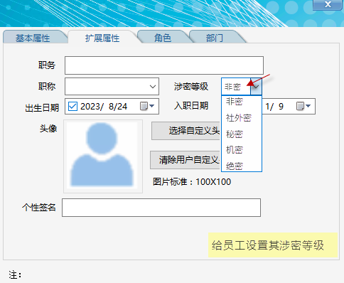 1、設置員工的涉密等級 (超過自身涉密等級的文件,將不能正常訪問。如:瀏覽、下載等)