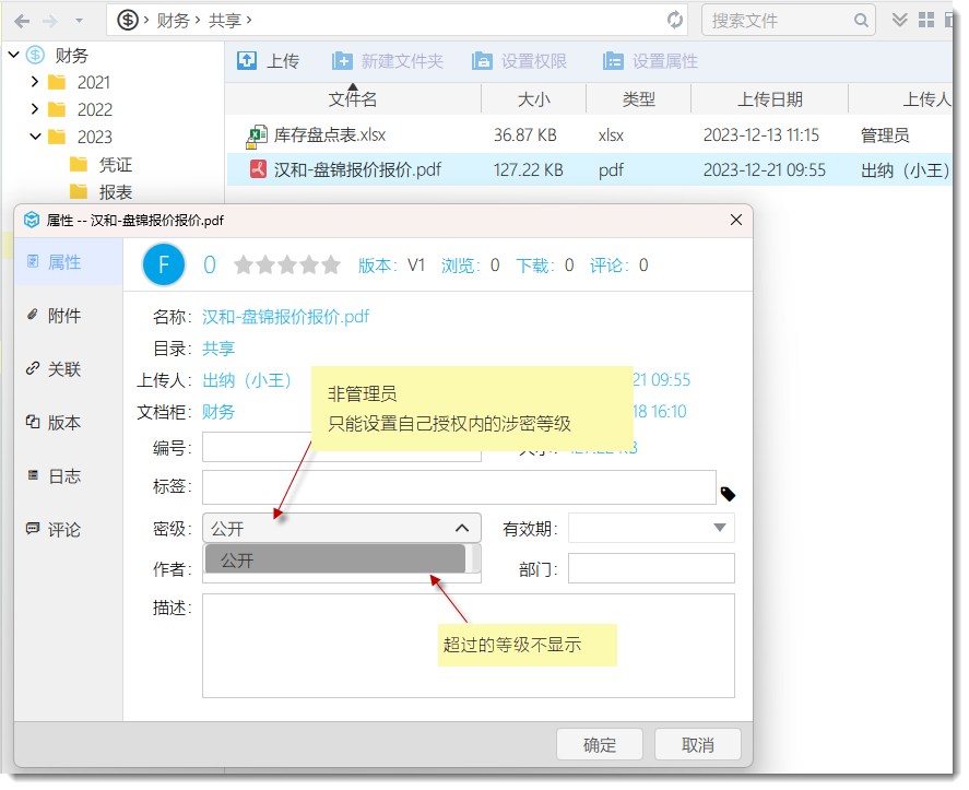 2、通過Mobox文件系統上傳的文件,管理員需要設置文件的涉密等級(所有等級)。