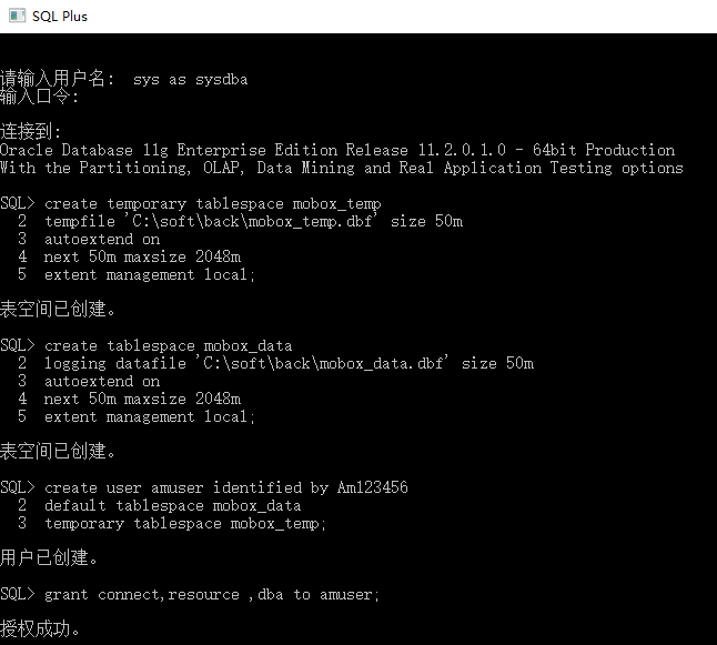 2、通過sqlplus創建oracle數據庫連接賬號(并創建空間、設置權限等),比如:amuser; (若甲方可以提供system賬號及密碼。當前步驟可以不做