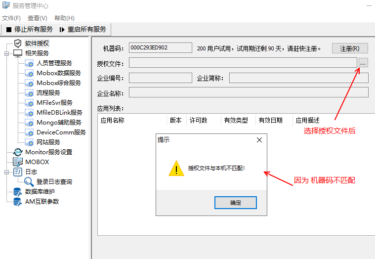 mobox系統(tǒng)部署后,我們需要得到當前機器的機器碼及甲方單位全稱,到公司申請授權(quán)文件。得到授權(quán)后進行注冊,mobox軟件才能正常使用。下文重點介紹在這個過程中關鍵點及可能遇到的問題。