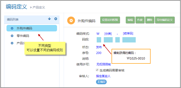 編碼定義即編碼規則定義,在該功能中可以定義某種編碼的組成規則,編碼由各種類型的碼段組成,碼段有長度和顯示順序及相互之間的關系。在編碼定義中可以設置編碼由哪些碼段組成?確定碼段的順序、碼段的長度、碼段之間的關系等信息,設置編碼的允許使用范圍,比如設置某一個編碼只允許某些人員、角色、部門能使用,也可以設置在申請編碼時是否需要有人審核,由誰審核? 可以有效對編碼的使用進行管理。