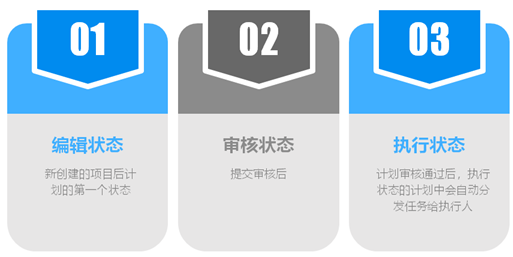 項目計劃中創建的任務并不能馬上執行,必須要通過審核后系統才能觸發任務下達。項目計劃有以下3個狀態